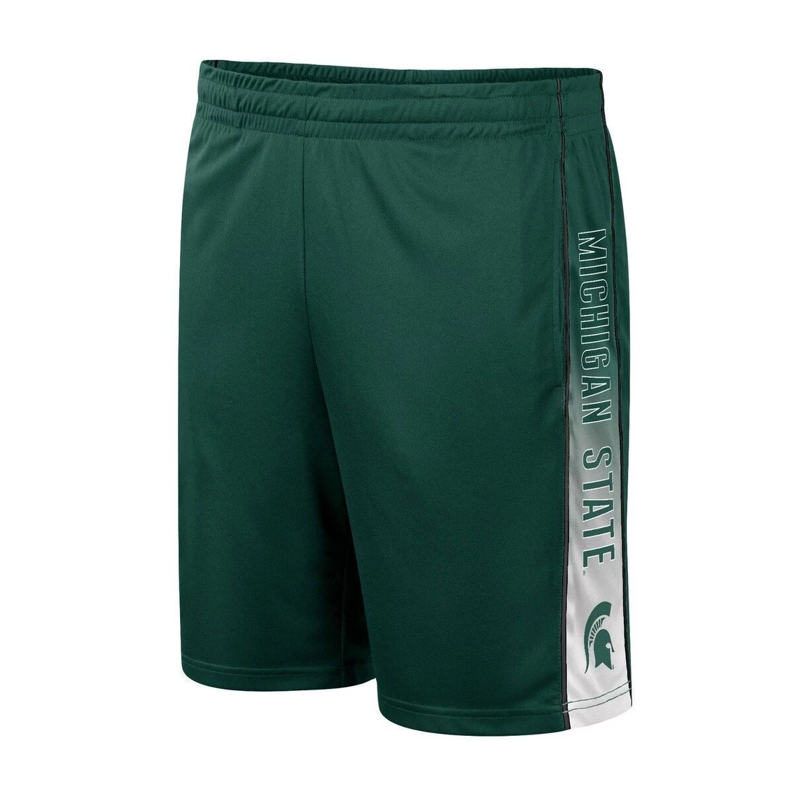 Carry your Michigan State Spartans pride with you each time you sport these Colosseum Lazarus shorts. They feature an elastic waistband that alters to your perfect size and convenient side slip pockets to hold small items. Best of all, the bold Michigan State Spartans graphics down the side are accentuated by an ombre design for a standout piece of fan gear. Machine wash, tumble dry lowSublimated ombre design down the sidesSide slip pocketsSublimated graphicsElastic waistband with drawstringMaterial: 100% PolyesterInseam on size M measures approx. 8.5”ImportedOfficially licensedBrand: Colosseum