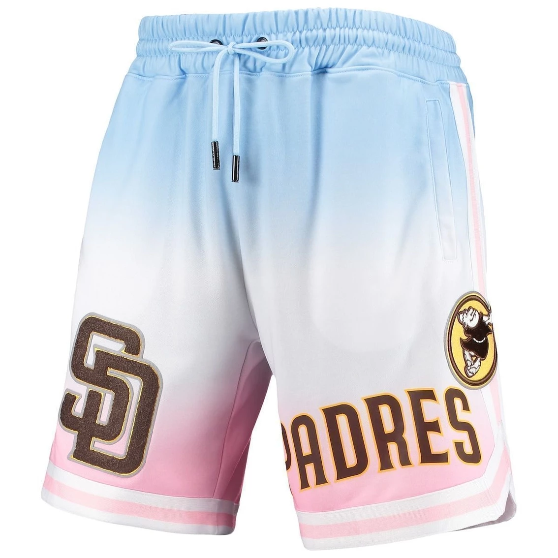 Pro Standard brings the heat both fashion- and fandom-wise with these Team Logo Pro shorts. Their ombre design and chenille applique pair with the vibrant San Diego Padres graphic for a sharp appearance. The elastic waistband, sewn-on stripes and side splits bring together the classic basketball shorts look. The modern finish over the old-fashioned base makes these a must-have for any stylish San Diego Padres fan. One zippered back pocketChenille fabric appliqueSublimated ombre designElastic waistband with drawstringEmbroidered graphics with raised detailsTwo front slip pocketsSide splits at bottom hemMaterial: 100% PolyesterMachine wash, tumble dry lowSewn-on stripesHeat-sealed graphicsImportedBrand: Pro StandardOfficially licensedInseam on size M measures approx. 8.5”