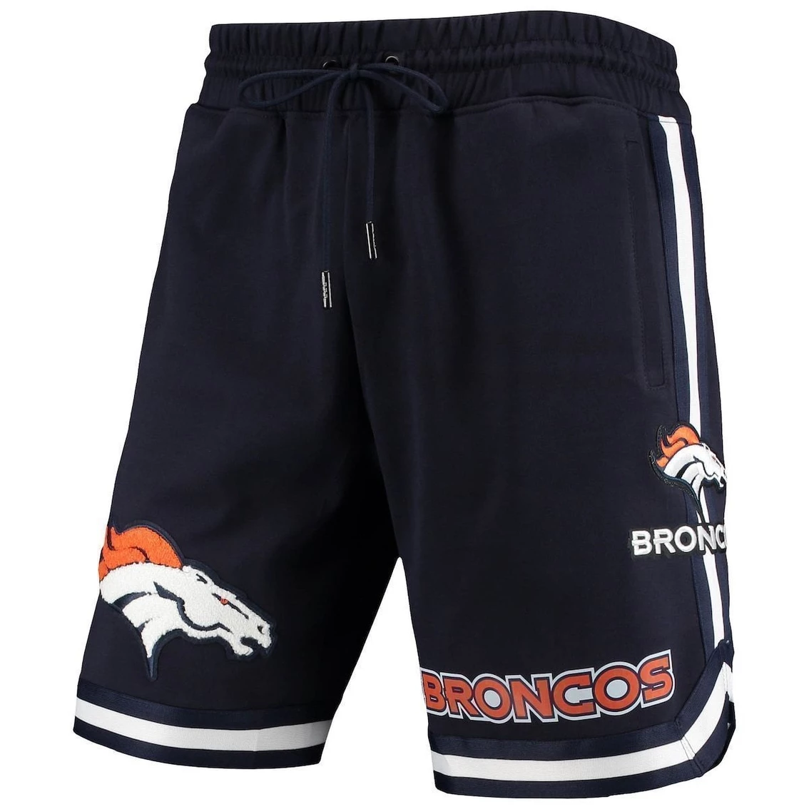 Take your pickup game or workout to the next level with these Denver Broncos Core shorts from Pro Standard. They feature an elastic waistband and drawstring to secure the perfect fit when you need athletic wear that will move with you. In addition, their Denver Broncos graphics will excellently showcase your fierce devotion to your favorite players wherever you go. Brand: Pro StandardTwo sewn-shut slip pockets that can be openedImportedZippered back pocket with hidden zipperInseam on size M measures approx. 9”Material: 100% CottonSewn-on stripesElastic waistband with drawstringHeat-sealed graphicsHeat-sealed chenille applique with embroidered and felt detailHeat-sealed fabric applique with embroidered detailMachine wash, tumble dry lowOfficially licensed