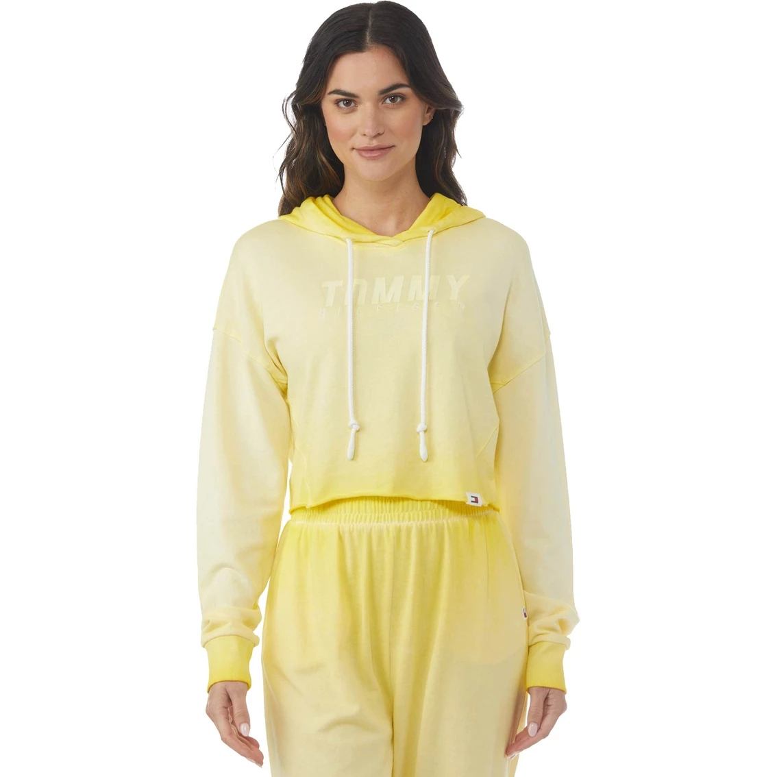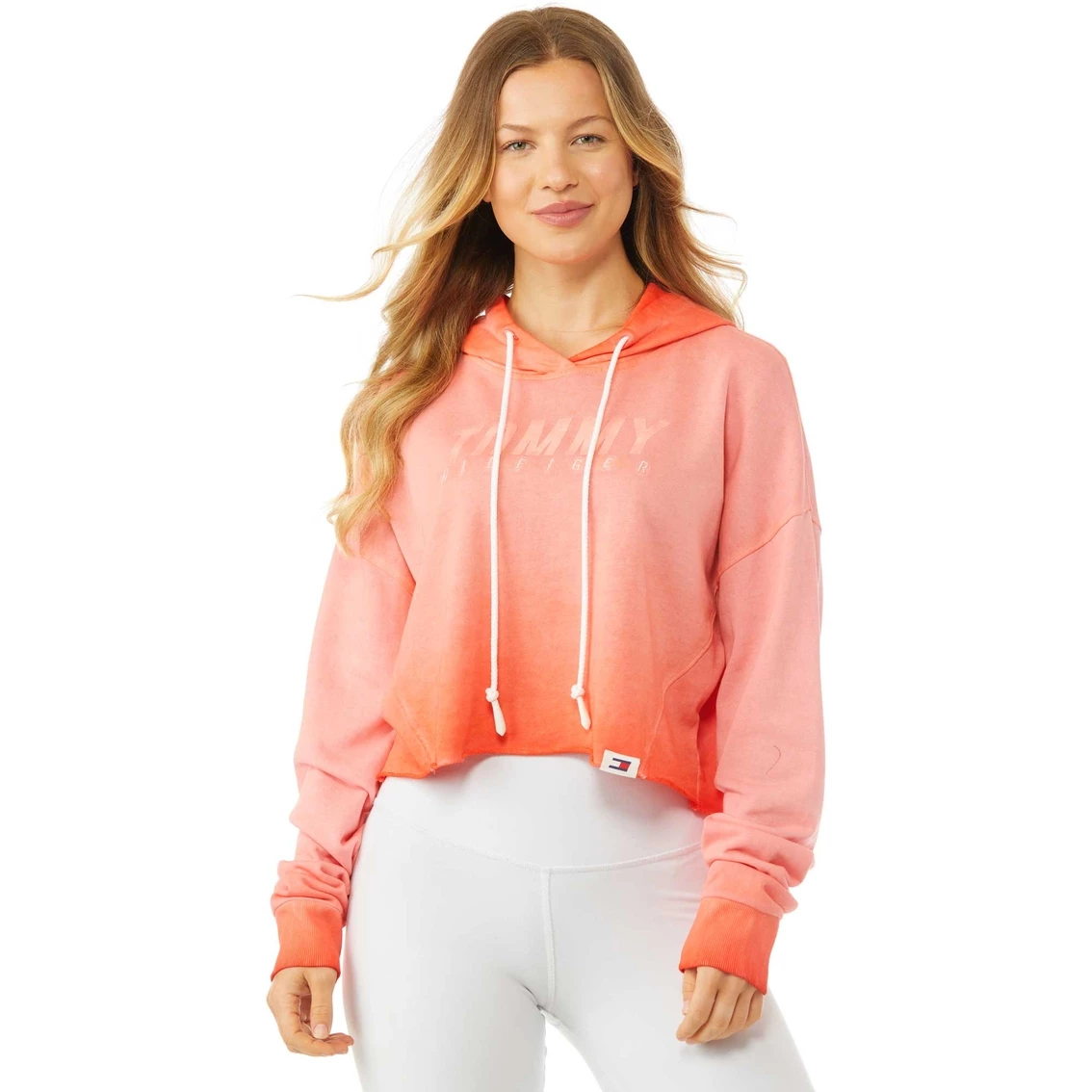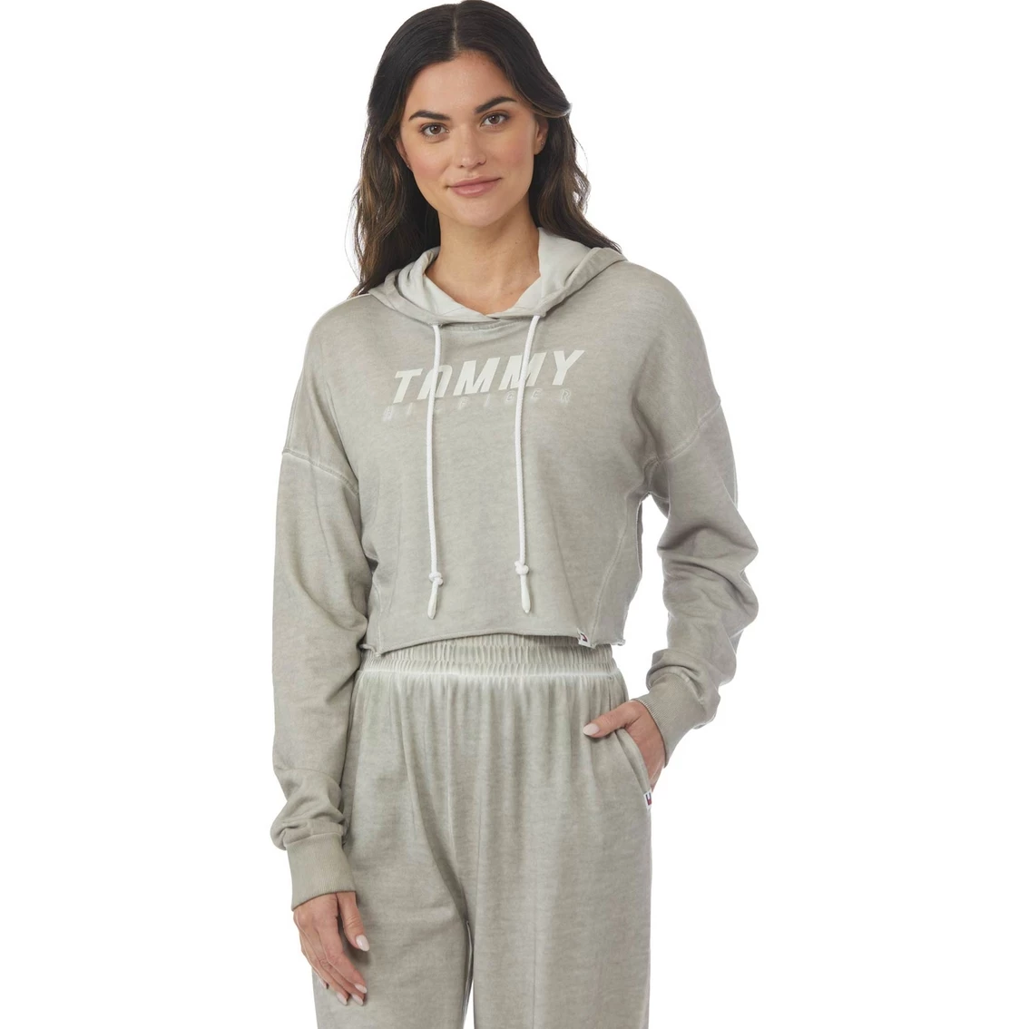 This long sleeve knit pullover Hoodie from Tommy Hilfiger Sport can be paired with jeans, leggings or the matching joggers for a head to toe look. It’s slightly cropped and is finished with an allover cool pigment dye, dot print, embroidered logo and a drawstring hood. Style: TP2T0287283.