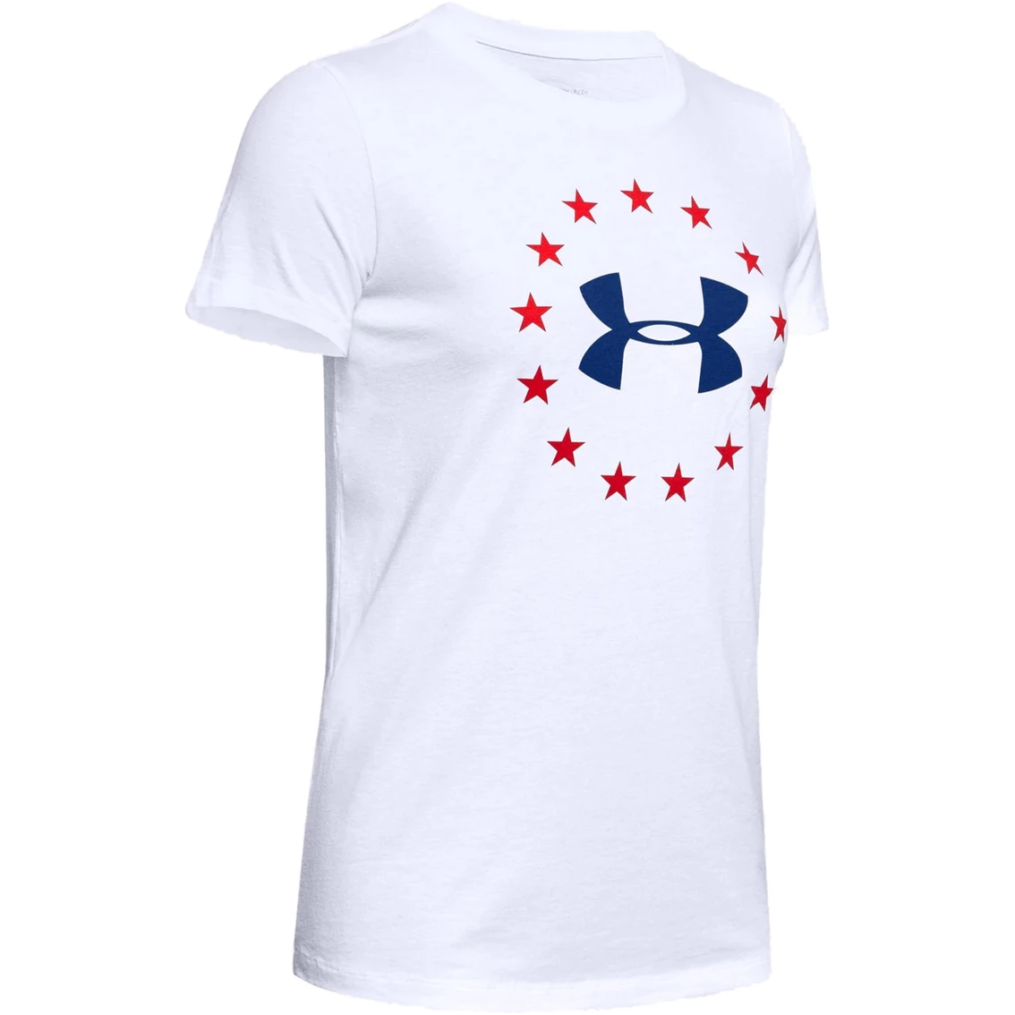 With a loose, generous, more relaxed fit, the short sleeve Under Armour Freedom Logo Tactical Tee is perfect for training or relaxing. Its super-soft, cotton-blend fabric provides all-day comfort, wicks sweat away from your skin and dries really fast. It has a ribbed collar and is machine washable. Style: 1333372.