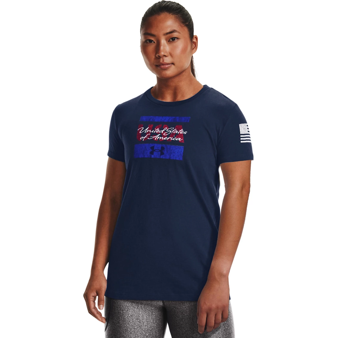 The Under Armour Women’s Freedom USA Tee is made of a super-soft, cotton-blend fabric that provides all-day comfort. It features a ribbed collar and short sleeves and is made of 60% cotton/40% polyester. Wash garment inside out. Machine wash on cold with like colors. Use only non-chlorine bleach when needed. Tumble dry low. Do not iron. Do not use softeners. Do not dry clean. Style: 1370121.