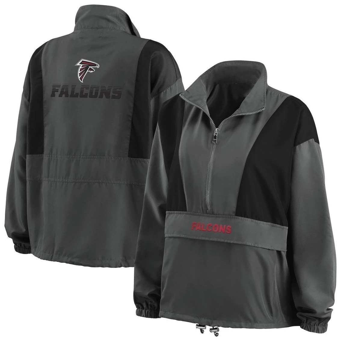 - Support your Atlanta Falcons with a functional piece of outerwear this season, the Popover Packable half-zip jacket from WEAR by Erin Andrews. Along with elastic cuffs and an adjustable waist hem, it features a half-zip closure and Olympic collar for maximum coverage. Atlanta Falcons graphics are displayed on both the front and back for a constant showcase of your favorite team.