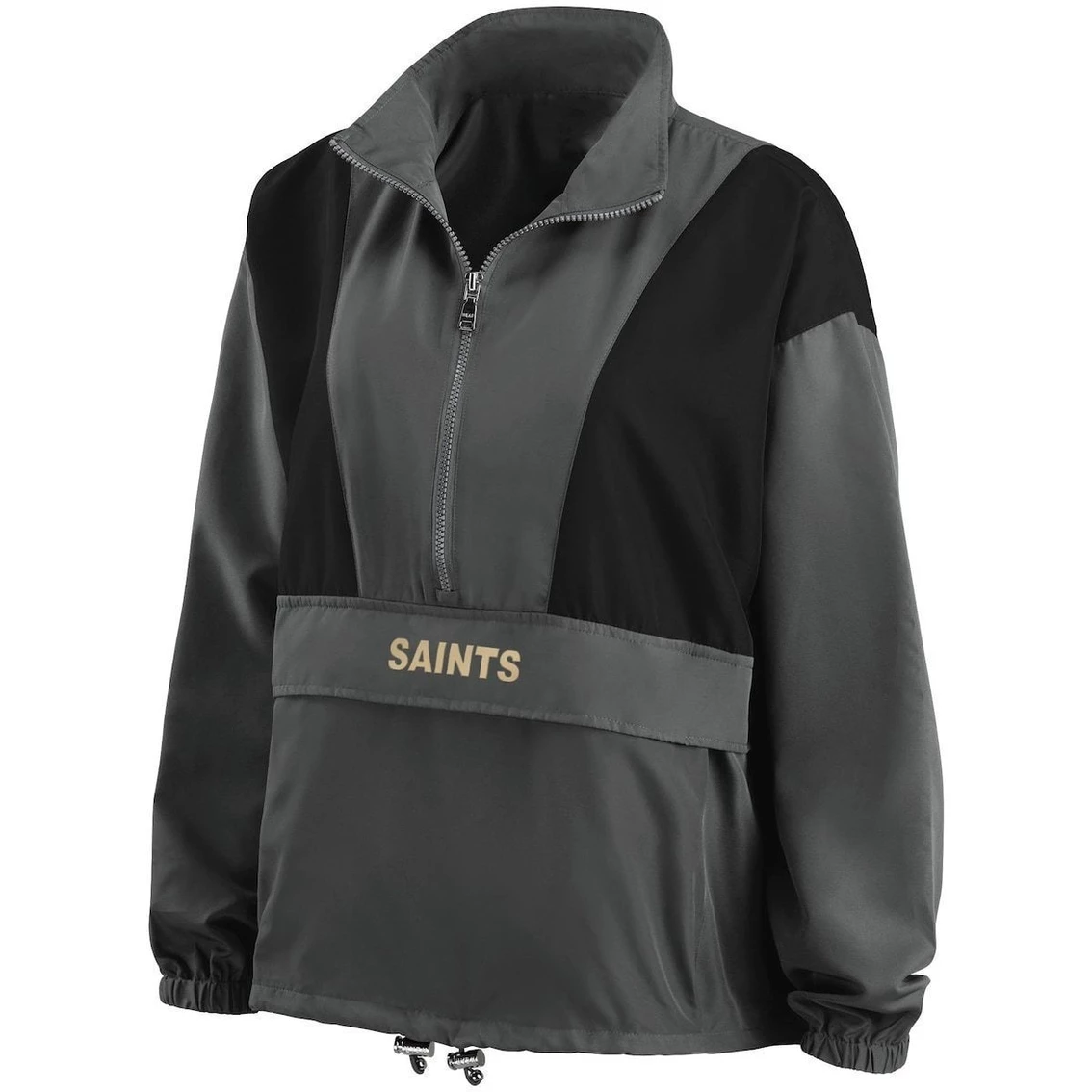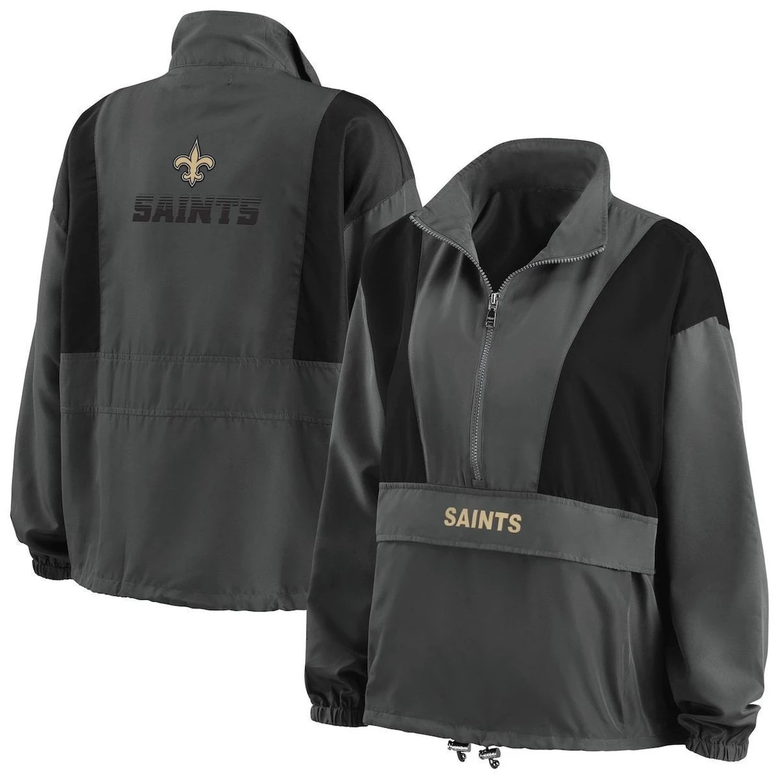 - Support your New Orleans Saints with a functional piece of outerwear this season, the Popover Packable half-zip jacket from WEAR by Erin Andrews. Along with elastic cuffs and an adjustable waist hem, it features a half-zip closure and Olympic collar for maximum coverage. New Orleans Saints graphics are displayed on both the front and back for a constant showcase of your favorite team.