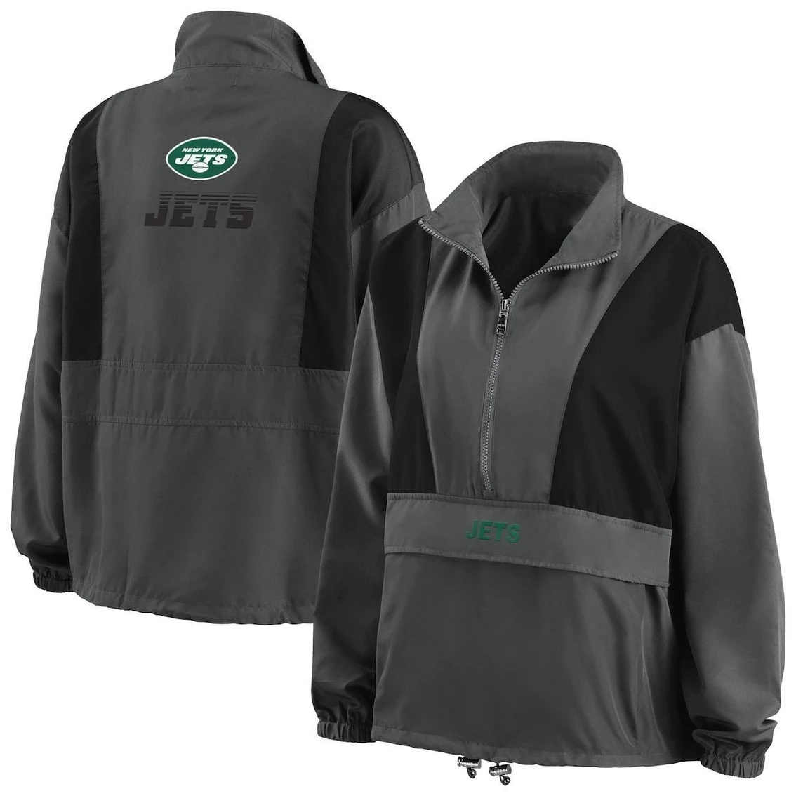 - Support your New York Jets in a functional piece of outerwear this season with the Popover Packable half-zip jacket from WEAR by Erin Andrews. Along with elastic cuffs and an adjustable drawcord, it features a half-zip closure and Olympic collar for maximum coverage. The hidden zippered front pouch pocket along with its packability is perfect for when you need storage on the go. Best of all, the New York Jets graphics are displayed on both the front and back for a constant showcase of your favorite team.
